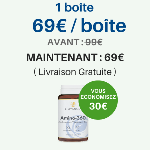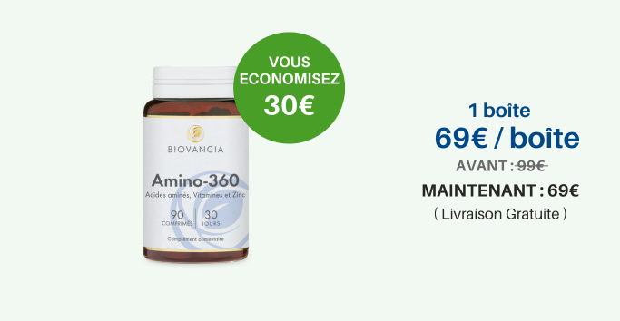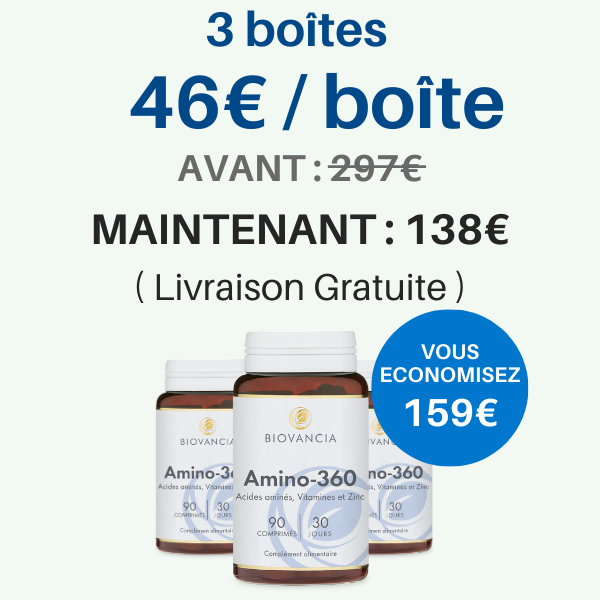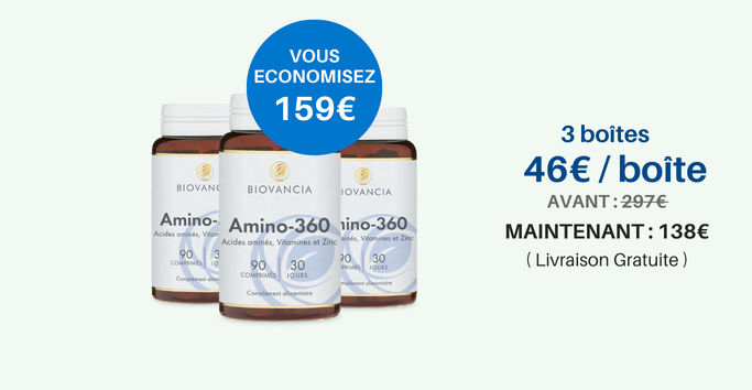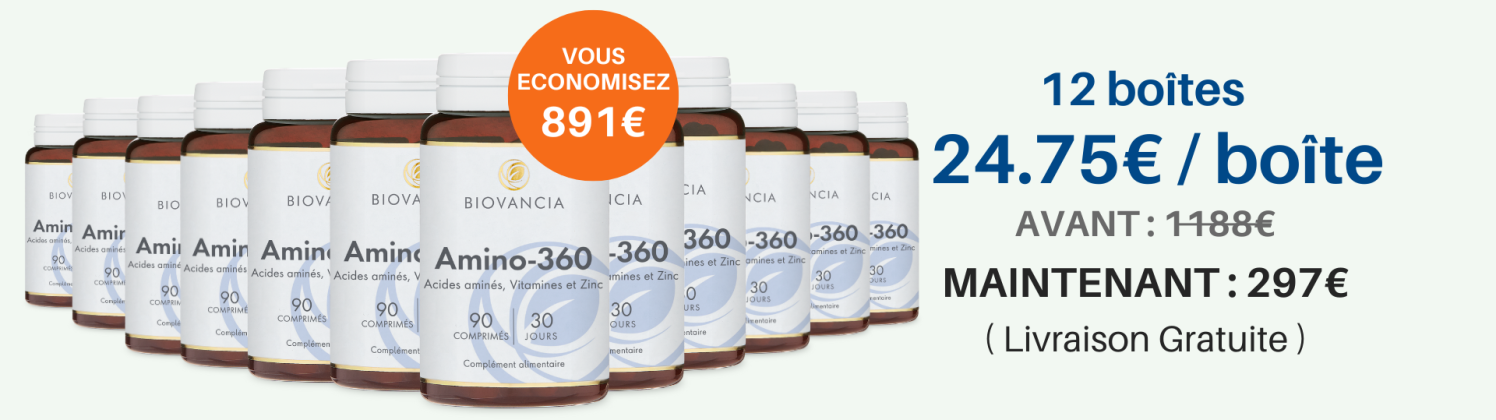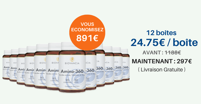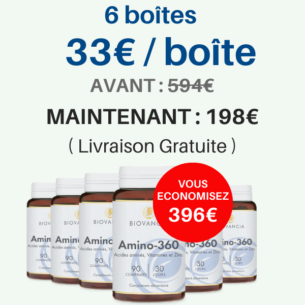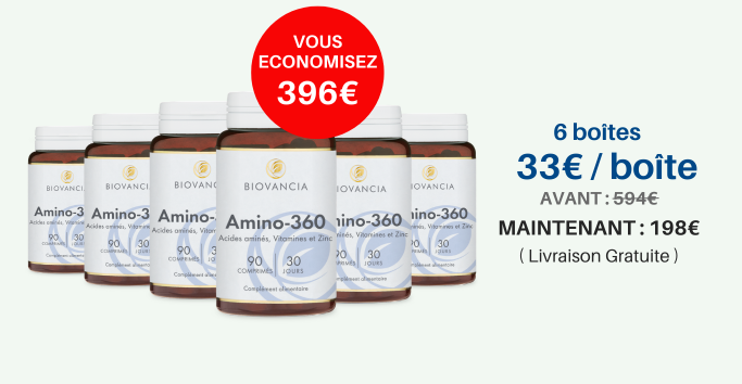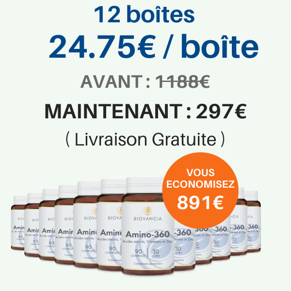 Amino-360 agit en contournant les faiblesses digestives liées à l’âge. Il fournit directement à votre organisme les 8 acides aminés essentiels, dans les proportions recommandées par l’Organisation Mondiale de la Santé (OMS).