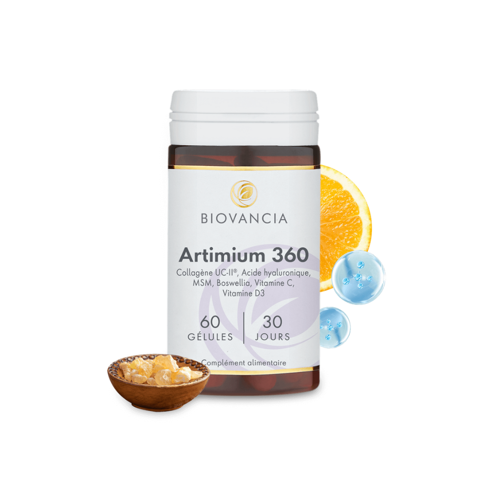Biovancia a mis au point Artimium 360, la seule formule qui contient les 6 actifs dont vos articulations ont besoin pour se régénérer chaque jour.