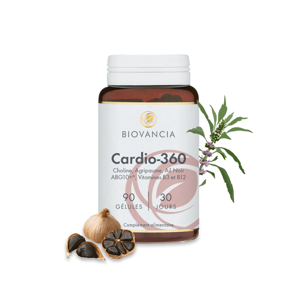 Cardio-360 réunit 5 actifs exclusifs pour maintenir une bonne santé cardiovasculaire : choline, ail noir (ABG10+®), agripaume, vitamine B3 et B12.