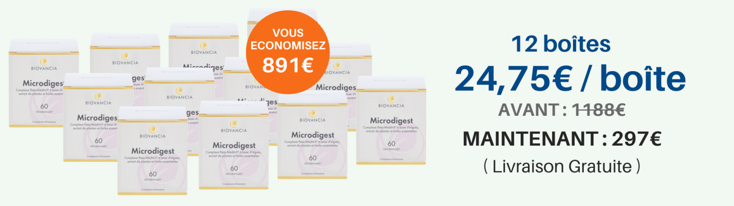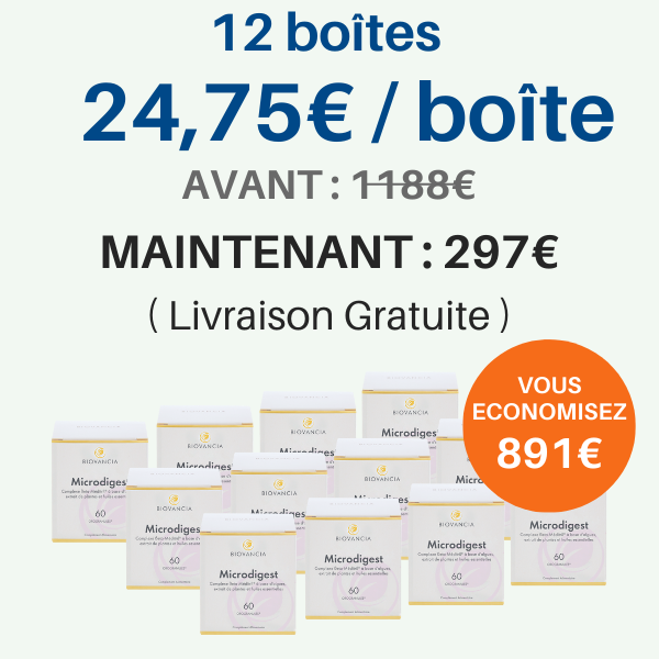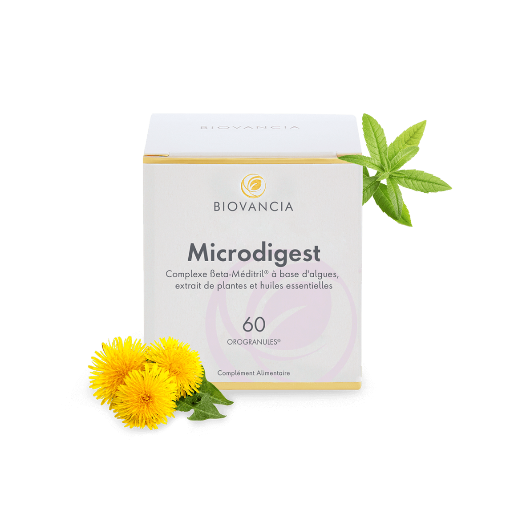 Microdigest combine un complexe nutritionnel infusé dans une Orogranule® pour améliorer le confort digestif : le β Meditril®, les extraits de plantes et les huiles essentielles.