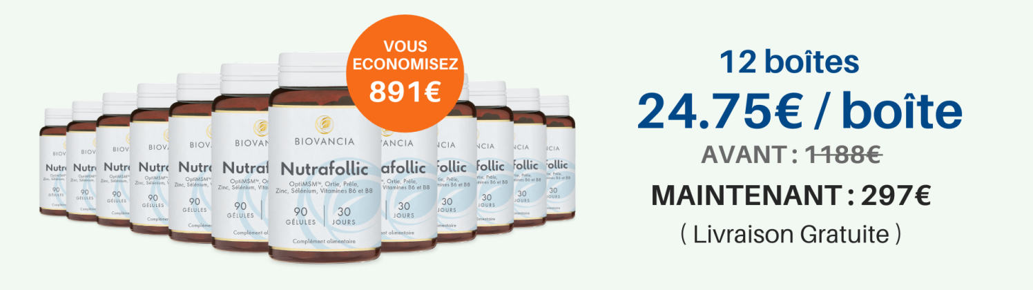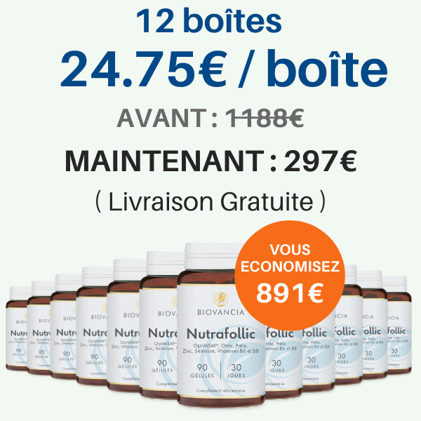 Nutrafollic associe 7 actifs cliniquement validés pour agir au niveau des follicules de vos cheveux et leur offrir une revitalisation durable.